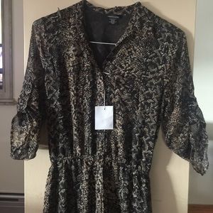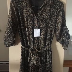 Button up, snake print maxi dress. It has an elastic waste with a tie in the back and rolled up sleeves.