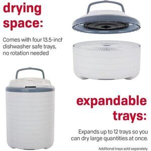 🧿EXPANDABLE TO 12 TRAYS: Comes with four (13 1/2″ diameter) trays and expands up to 12 trays so you can dry large quantities at once with no tray rotation needed; additional trays sold separately