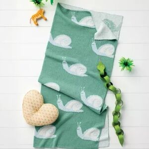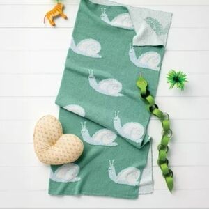 Add a cozy finish to your kid's room with this Snail Knit Throw Blanket from Pillowfort™. This throw blanket features allover snail print on a green backdrop for a fun and whimsical look. Made of soft recycled polyester-blend fabric, this knitted throw blanket feels super cozy as they wrap it around themself while enjoying a short nap, reading a book or lounging on a couch.