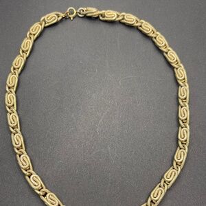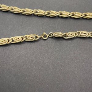 This vintage gold tone snail link chain is in good condition. By appearance of the chain and patterned coils I believe this is a Sarah Coventry piece. There were previous repairs to the clasp that likely removed the hallmark.