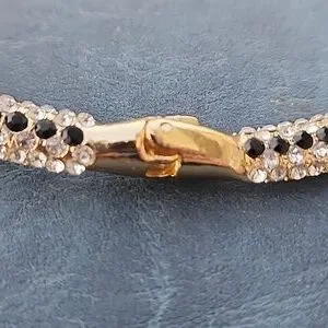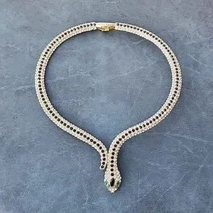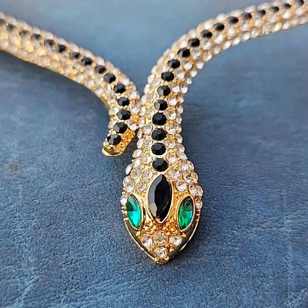 This captivating snake 🐍 will slither her way around your neck. She is a choker after all. If you are able to gain her loyalty, she will dazzle perfectly on your neck. She will allow her Oynx and Clear Crystals to shimmer in amazement. Her Crystal Emerald colored eyes will hypnotize any on-looker.