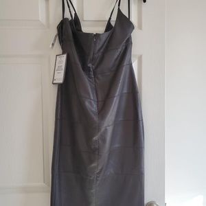 Never Worn....Looks like leather but it isn't. But when you put it on it looks awesome it has a soft feel and it has a zipper in the back to make it easy to get into. Let's not kid ourselves we MUST have the figure to wear this dress. This is a XL and it is a beautiful dress that will get lots of attention. We are not going to be in the house always so when you come out.....make it a smash entry with this dress.