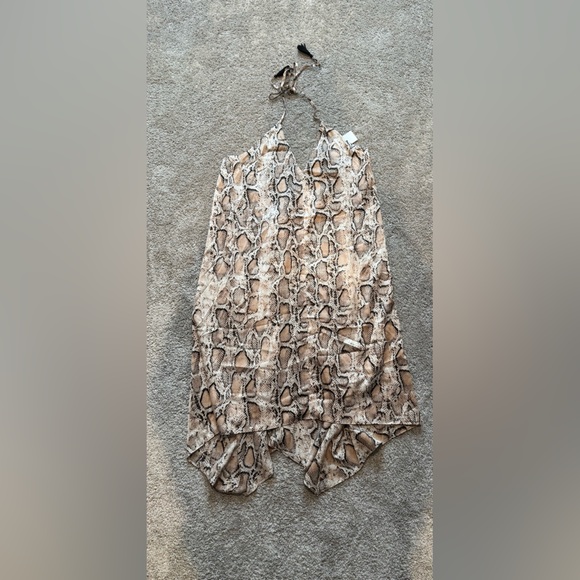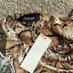 Chic Aakaa dress with a striking snake pattern. Features beige and black tones.