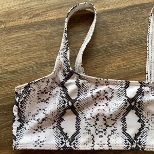 No brand black and white snake print bikini top with some spots of pink throughout. Some discoloration on the interior seams. No padding, but there are openings to add padding if desired. Size small.
