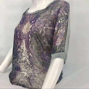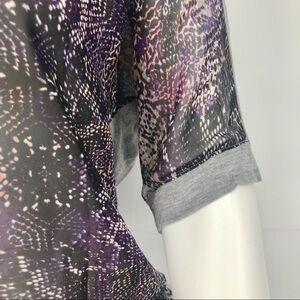 Colorful Snake Print Chiffon Front Tee. Front is poly chiffon and back is solid gray. Gray neck and cuffs. Slight batwing sleeve. Layflat chest measurement is approx 22”. Flowy after that measurement.