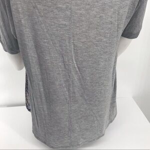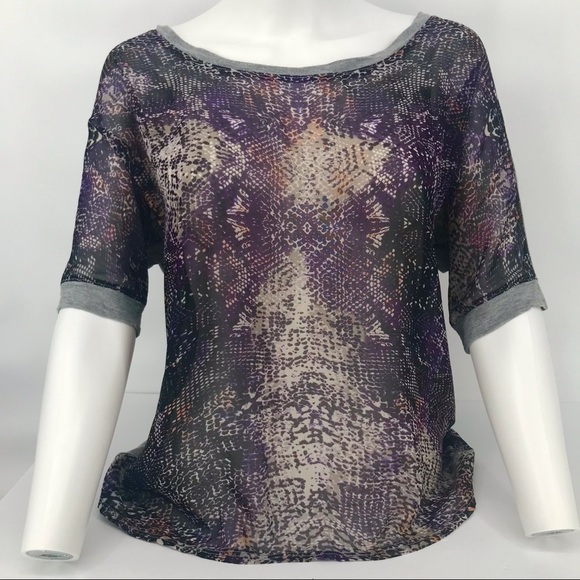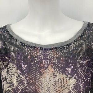 Colorful Snake Print Chiffon Front Tee. Front is poly chiffon and back is solid gray. Gray neck and cuffs. Slight batwing sleeve. Layflat chest measurement is approx 22”. Flowy after that measurement.
