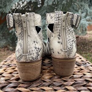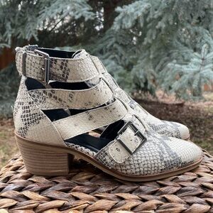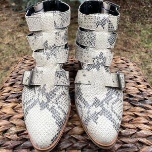 Crevo Jessamine Cream Leather Embossed Snake Print Pointed Toe Strappy Ankle Boots.
