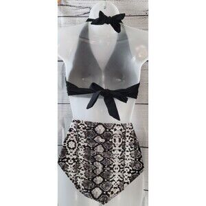 * Description: Bikini set with black halter V-neck and adjustable tie-back design with high waist snake print bottoms.
