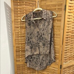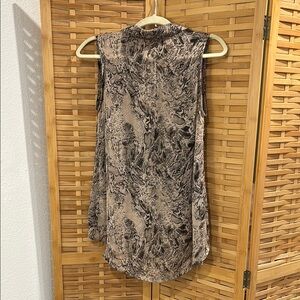 This elegant sleeveless blouse features beautiful snake print, an asymmetrical design and a notched collar, offering a chic and modern look. The neutral color palette adds a versatile touch, making it suitable for various occasions. Its flowing fabric ensures a comfortable and stylish fit.