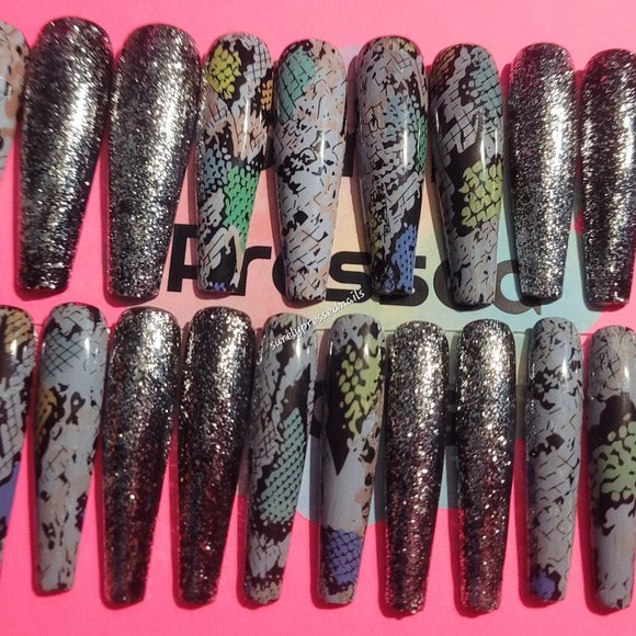 Unleash your inner style icon with this extraordinary Snake Print Shimmer Press-On Nails! These nails are the epitome of uniqueness, featuring a captivating snake print adorned with shades of yellow, green, black, and blue, complemented by a silver shimmer on full-coverage, 2XL length, ballerina-shaped nails.