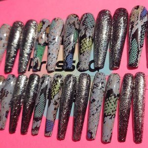 Snake Print, Sliver Shimmer 2xl Ballerina Press on Nails