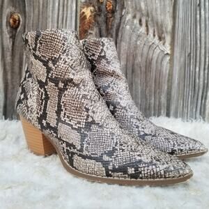 Synthetic upper in a reptile python snakeskin animal print in shades of tan, brown, gray. Pointed toe, ankle height short bootie, side zip, chunky heel. Issues noted in photos. Very good preowned condition, overall. Size 7.5M by Lulus X Matisse. Style: Spirit.