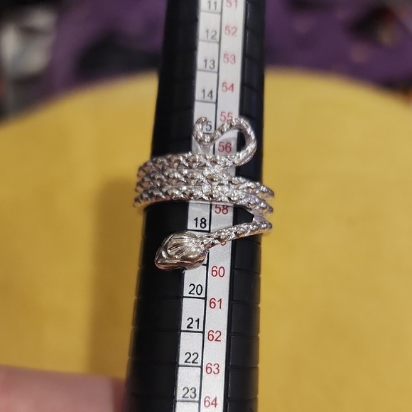 Silver toned, costume snake ring. Signs of wear on inside. Green gemstone eyes. Size 8.