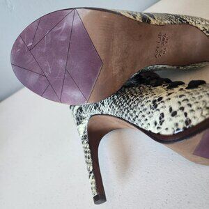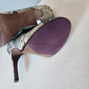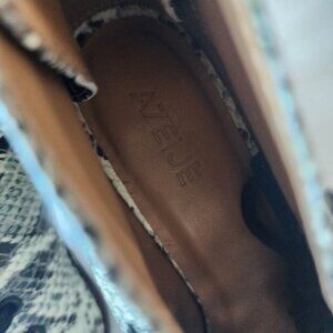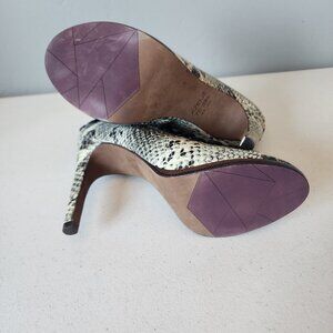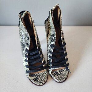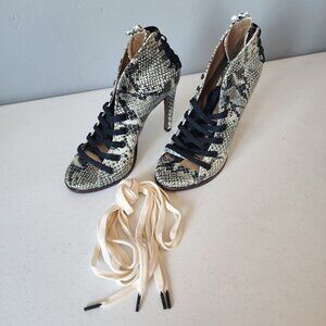 "NEW" Edgy & Gorgeous Looking Snake Skin & Leather Lace Up Heeled Bootie By A7EIJE. Lace Up Style with Peep Toe, Cushioned Foot Bed, Back of Heel Is Woven Elastic Strapping Accent, Almond Toe, Wrapped 4" Heel & Leather Soles, New, Never Worn, Only Tried On:) Rt. 295.00 approx. Size 7.5, Foot Bed Measures 9.5" for Reference. * Comes with Extra Cream Laces.