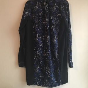 Blue and black snake skin print. Print is in front and back with solid black down the sides. Buttons all the way down. 100% polyester. Only worn once.