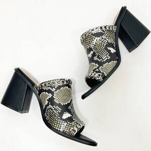 Snake embossed peep toe mules, womens 7.5 python pattern chain trim chunky heels