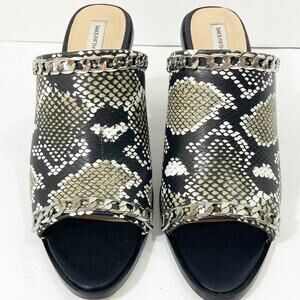 Python snake print leather peep toe mules from Saks Fifth Avenue. Size 7.5. Silver chain trimmed vamp, chunky black leather wrapped 3.5" high heel. Minimal wear. Sole bottoms are barely scuffed, very faint scratches on inside right shoe heel, faint hairline crack on middle of right shoe vamp (Cosmetic, vamp is intact). Please see above pics. None of these flaws are noticeable without close examination.