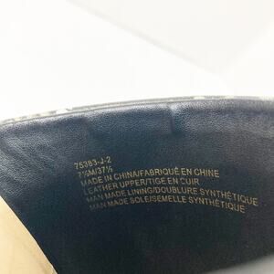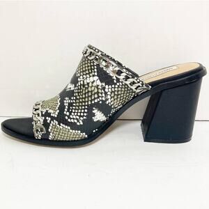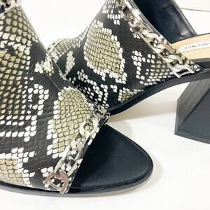 Python snake print leather peep toe mules from Saks Fifth Avenue. Size 7.5. Silver chain trimmed vamp, chunky black leather wrapped 3.5" high heel. Minimal wear. Sole bottoms are barely scuffed, very faint scratches on inside right shoe heel, faint hairline crack on middle of right shoe vamp (Cosmetic, vamp is intact). Please see above pics. None of these flaws are noticeable without close examination.