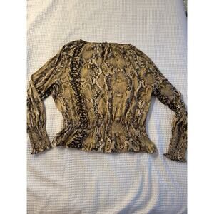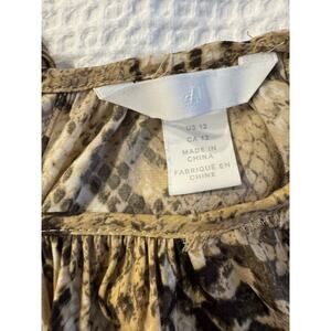 Make a statement with this sleek H&M snake print blouse, a must-have for those who love to stand out. The beige color palette coupled with the exotic snake theme delivers a bold, yet versatile look that can transition effortlessly from day to night. Crafted for the fashion-forward woman, this size 12 top features a dropped waist design, adding a modern twist to a classic silhouette. The long sleeves provide a sophisticated touch, perfect for any occasion that calls for a touch of elegance. Whether you're headed to the office or going out for a casual dinner, this blouse is an ideal choice that doesn't compromise on style or comfort. Add this piece to your wardrobe and enjoy the blend of trend and timeless fashion.