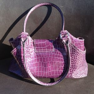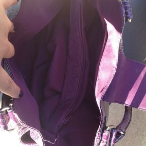 This purse is very glossy and shiny. Probably medium sized. Two pockets on the outside, Two zipper pockets on the inside.