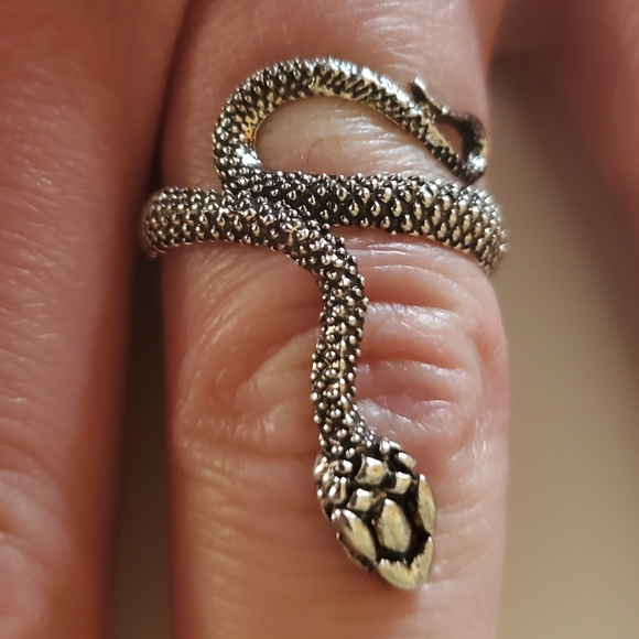 snake ring not sure what it's made out of but it looks really cool. costume jewelry not silver.