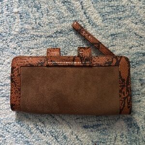 This item is made out of genuine leather and suede. There are no flaws. It is 9 x 4 1/2”.