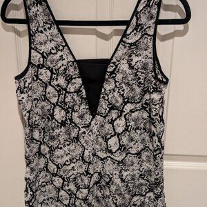 Elevate your wardrobe with this trendy and stylish Express cut-out tank dressy top. The black and white snake print with a subtle cut-out at the front and back adds a touch of uniqueness to your outfit. The V-neckline and wide straps make it perfect for both casual and party/cocktail occasions. The wide band keeps it semi modest and hides bra. Crafted from light-weight polyester fabric, this top is machine washable and easy to care for. The relaxed fit ensures comfort while the modest cut-out detail adds a touch of elegance. This top is a size XS. Get your hands on this wardrobe essential now!