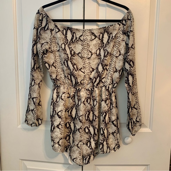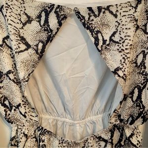 Cute, short snake-print romper. High neckline, open back, elastic waist. Super light-weight and airy. Only worn a handful of times and in great condition. One small sign of wear on inside hem of leg. Great for the fall/winter!