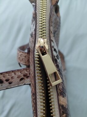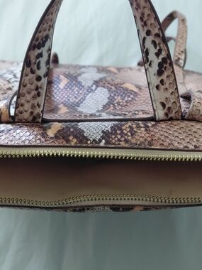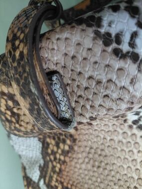 Chic snake-print backpack in brown and cream tones. Smooth faux-leather exterior with striking python pattern. Versatile design for everyday use and travel. Adjustable straps for comfortable wear and convenient side pocket. Complements many outfits.