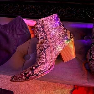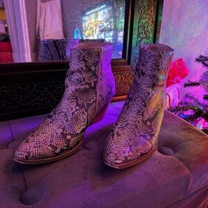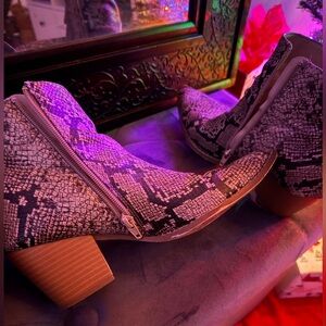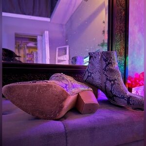Snake-print heeled booties in good conditioning other than some light wear. I haven’t tried fixing them up / buffing out the scuffs so you may be able to make them look even better! Aside from that, these are pretty sturdy / easy to wear! The shaft of the boot is firm but not uncomfortable so it keeps it shape and is flattering around the ankle. Easily dressed up or down! (: