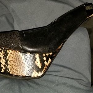 "Rhys". Black slingback stilettos. Snakeprint heel and front sole. Leather upper. Man made lining.
