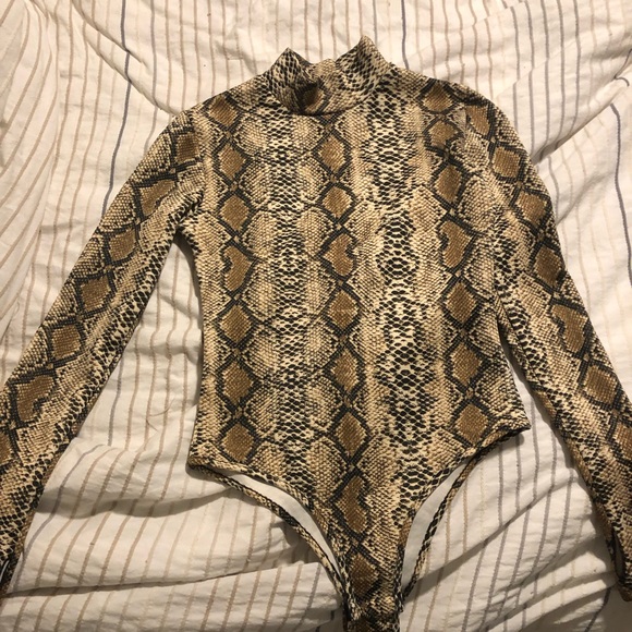 Snakeskin body suit 95% polyester, worn once. Size L on tag but fits like S/M so labeled accordingly on post.