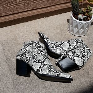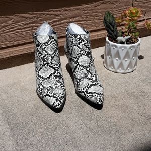 Pointed toe, blk/white/gray, reptile patterned, side zips with tassels, pointed toe booties! So shiek! So cute! Never worn. SZ 8.5 M With & 2 inch heels. Update your look by wearing them with your favorite dress. Wear these and your style will ne at another level! DISCOUNT APPLIES AS A FIRM PRICE FOR THESE "NEW" CUTIE BOOTIES.