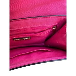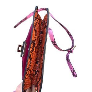 Aldo snakeskin-embossed patchwork crossbody satchel in a bold pink, yellow, turquoise, and brown mix. Features silver-toned chain hardware, oversized turquoise tassel, and structured satchel silhouette with top handle and adjustable crossbody strap. Fully lined hot pink interior with zip and slip compartments. Measures approx. 9” x 7” x 3”. Maximalist, eclectic design makes this perfect for Y2K styling, festival outfits, or as a bold statement bag with jeans and loafers. Pair with vintage blazers, slip dresses, or western boots from my closet.