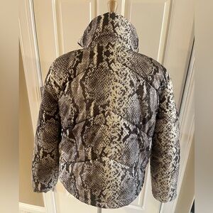 Excellent used condition fashionable Animal print, snakeskin puffer coat. This has a brown and cream colored snake skin look. This coat has two pockets on each side of the jacket and the zip is completely intact and works well. Perfect coat to step up your fashion and stay warm! All of my items are well cared for and come from a smoke free home!