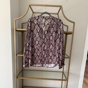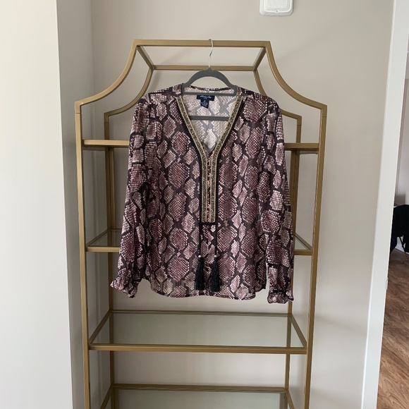 Chic purple hue snakeskin print pullover blouse. Has fun black tassels and gold chain and silver stone appliqué down the v-neck and front. Worn once. Super cute with black skinny jeans and booties.
