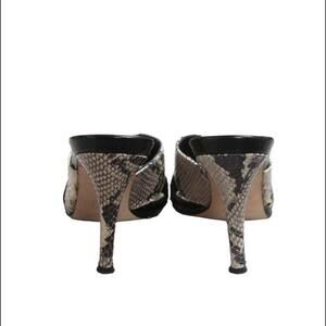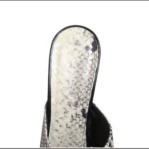 Elevate your shoe game with these stunning snakeskin Python Print Roccia Patsy Crossover Sandals Heels in size 8 from bebe. The almond toe and strappy style provide a comfortable fit, while the mid-height stiletto heel adds a touch of elegance. The black leather upper material is accented with animal print, making these shoes a statement piece for any outfit.