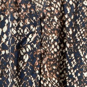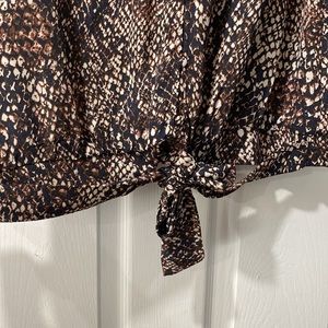 Snakeskin top, size medium. Top was purchased from charming Charlie’s when going out of business. Worn 2x! Top has flutter sleeves, a tie on the bottom that does not affect tightness, and buttons going down the front as seen in photos.