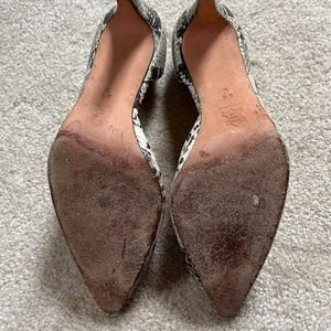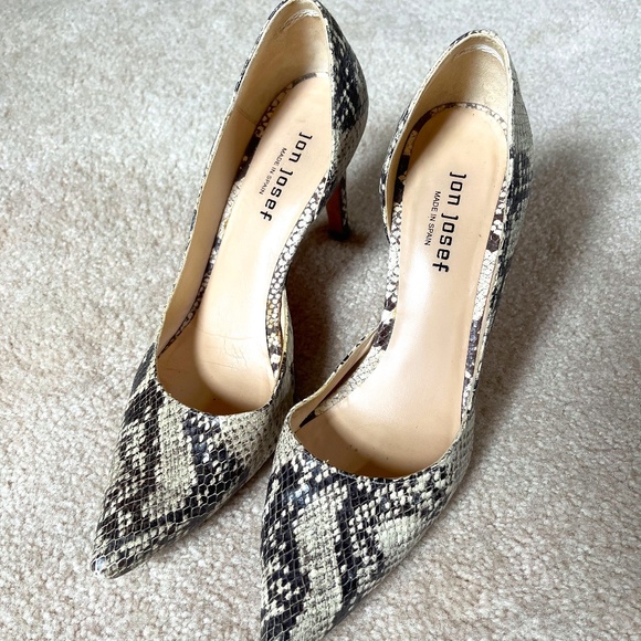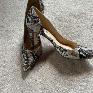 Snakeskin leather heels with cut out along inside. 3 1/2" heels. Good condition.
