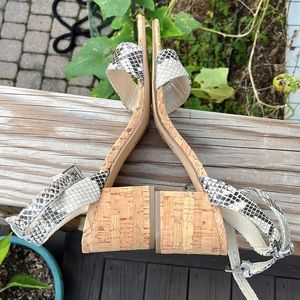 NWT never worn, Adorable faux snakeskin sandal with ankle strap. Large chunky cork style heel. Size 9 1/2.