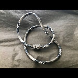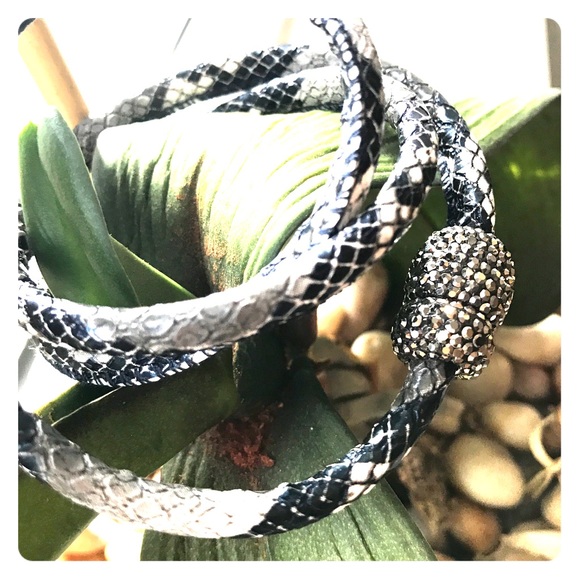 Black & white snakeskin bangle with cz stones at magnetic enclosure. Can wrap 2-3x depending on wanted look, or alternatively wear it as a necklace. An accessory that works with every season!