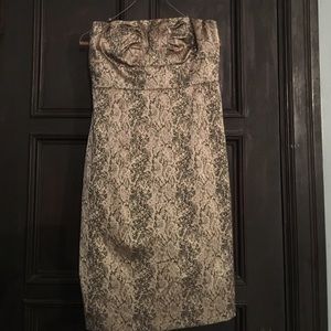 Strapless "snakeskin" cocktail dress. Fully lined. Metallic champagne and black. Empire waist.