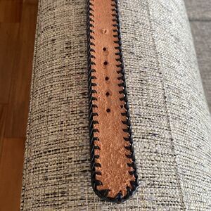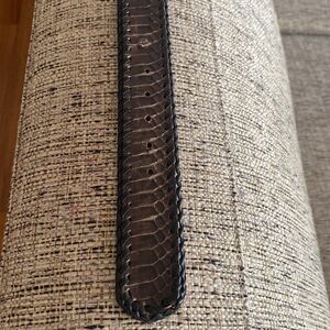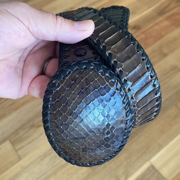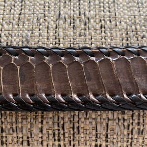 Really a great design. Brown snakeskin leather with a whipstitch finish. Looks like someone added an extra hole. - see the last picture. Measures 39.5” x 1.5”.