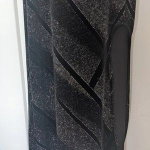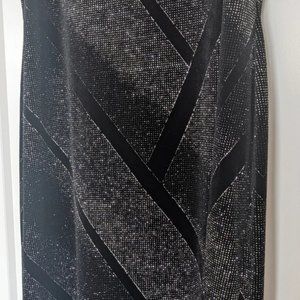 This dress is stunning! It is fitted, but falls well and has a high side slit that makes it super sexy. Lightweight fabric, stretchy, no wrinkle, no hassle, faux velvet dress. Excellent condition. Perfect for a holiday party, wedding, special occasion, etc. Photos do not do it justice.