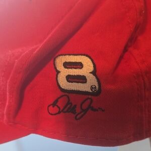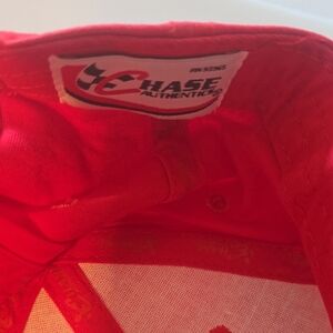 Bold red cap with racing design. Features Snap branding. Ideal for motorsport fans.