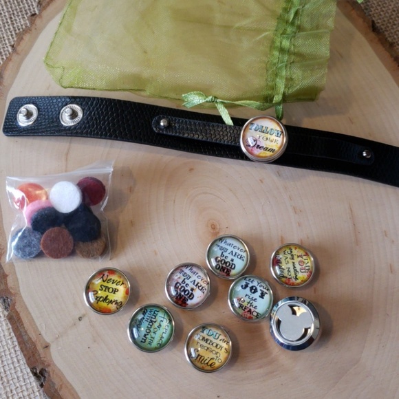 Black adjustable snap bracelet includes 8 motivational snaps, 1 Mickey diffuser snap, 10 colorful diffuser pads, and 1 green storage bag. Bracelet is approximately 6.5 inches on smallest size and approximately 7.5 inches on biggest size. As usual, sizes are approximate and may vary slightly.