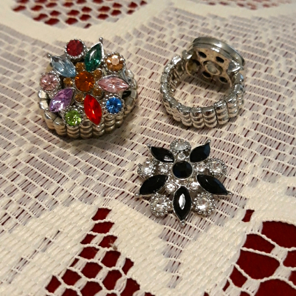 Snap button ring is a stretch band size S/M fits comes with 2 18mm charms. Interchangeable with other snap jewelry. Smoke free home. Thank you.