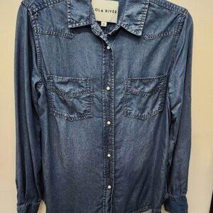 A medium weight snap close, 2 pocket jean shirt by Lola River in a medium blue. It is in like new condition since it was only washed in a laundry bag and hung to dry. It is a women's size small.