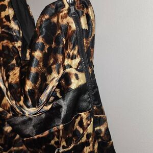 one shoulder style and has the zipper and hook and eye clasp on the side. The bust is pleated and has a solid black accent right below it all the way around the dress. The color of the dress is Brown and black and it is an animal print. The bottom of the dress is pleated from one side to the other. The dress would be considered knee length. The lining is made out of 100% polyester and the rest of the dress is 97% polyester and 3% spandex