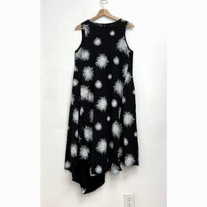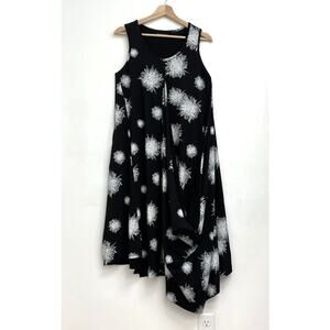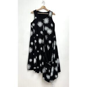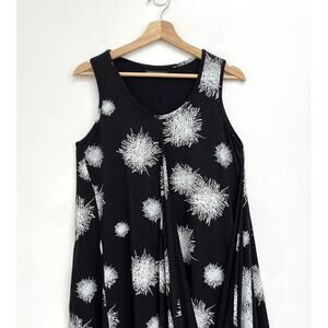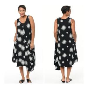 “The Angelina Dress is a sleeveless midi-length dress with dramatic, asymmetrical draping. In-seam side pockets, soft cotton fabrication, and a starburst print complete the fun design!”